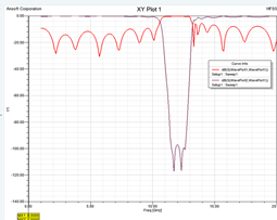 根據前面的分析,采用支線式結構設計濾波器能夠滿足15%阻帶帶寬的要求,根據阻帶衰減要求,取n=10,采用RT/durold®6002陶瓷板作為基板,相對于微帶線來說,懸置帶線能夠減小損耗,能夠獲得更加優越的過渡帶特性。在ADS中建立原理圖,給出各短截線及主線的初值并優化,從而得到帶阻濾波器的各結構參數的較準確的值,在此基礎之上,采用Ansoft公司的三維電磁場仿真軟件HFSS建立三維模型,進行參數掃描或者優化,確定參數的精確值,得到滿足指標要求的仿真曲線,如圖3所示,阻帶衰減大于45dB的范圍約為16%,通帶插損不大于2.0dB,滿足設計指標的要求。這樣,既利用了原理圖設計的簡單性及快速性,又利用了三維電磁場仿真的準確性,從而可以快速而準確的設計出所需要的濾波器電路。
